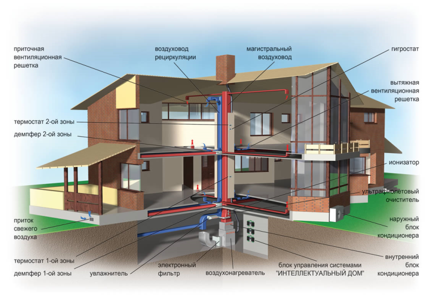 Приточно-вытяжная система. Сложная конструкция, использующая два отдельных воздуховода: один для притока воздуха, другой – для отвода.