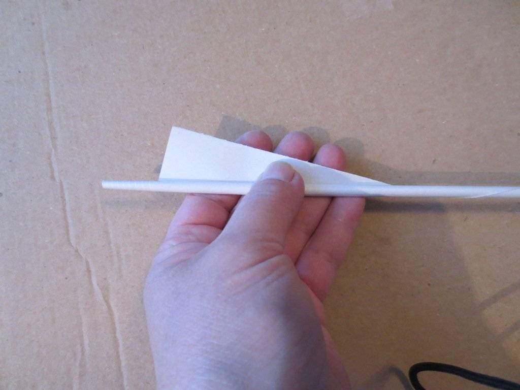 Пусть вас не смущает, что начало трубочки получилось тоньше, а конец – шире. Это нормально. Теперь нужно научиться сращивать две трубочки между собой. С одной более узкой стороны трубочку следует приплюснуть, подогнуть и вставить в другую с более толстой стороны.