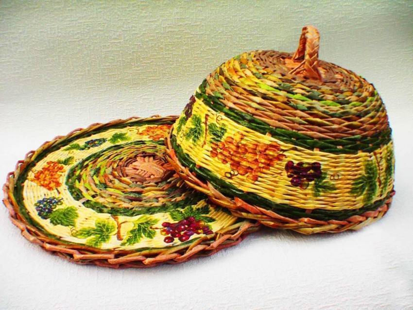 Красить трубочки из газет можно до начала работ или когда изделие уже будет готово. Для придания цвета натуральной лозы используют морилки, для покраски в более яркие цвета — обычную гуашь смешанную с клеем ПВА.