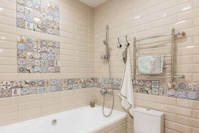 На фото плитка кабанчик бежевого цвета со вставками в стиле пэчворк на стенах в интерьере ванной.