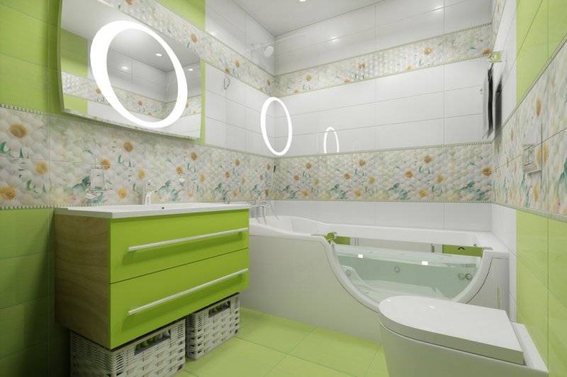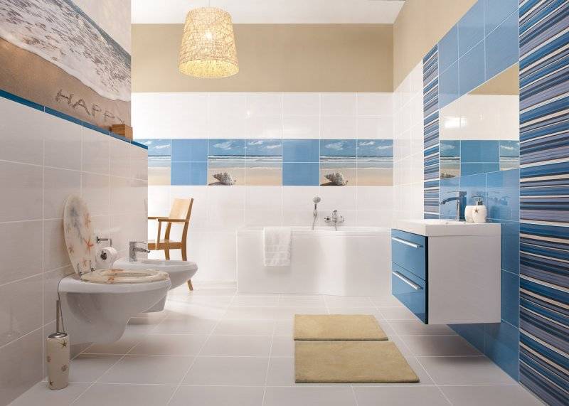 - брызги (актуально в больших ванных, где большая часть поверхности однотонна и в хаотичном порядке расположены «всполохи» другого цвета, как брызги);