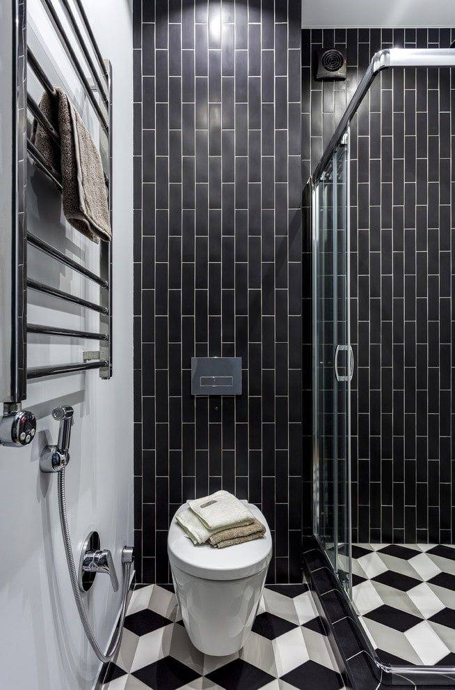 - Темная плитка для ванной чаще всего используется для оформления больших помещений в стиле модерн.
