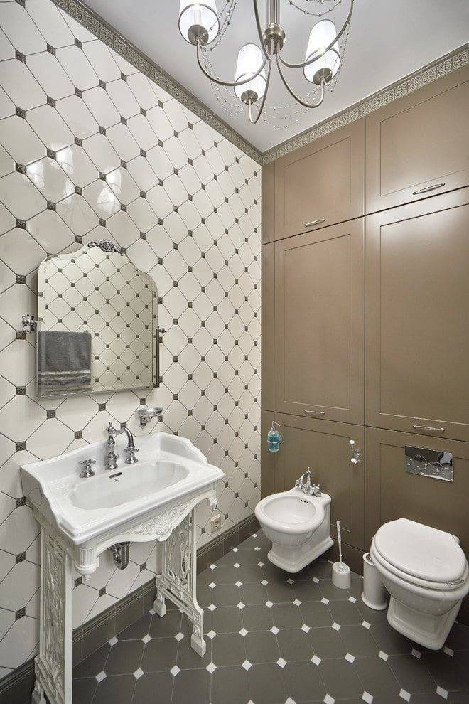 Классическим и довольно распространенным решением, является оформление верхней части в светлом цвете, а нижней в более темном, с использованием четкой бордюрной линии. Однако данный вариант раскладки, не следует применять в маленьком санузле. В таких комнатах лучше будет смотреться однотонный кафель в бежевых, оливковых, светло-коричневых, серых или белых тонах. При декорировании небольшого санузла с помощью двухцветной облицовки, желательно, чтобы выбранные элементы не слишком контрастировали друг с другом.