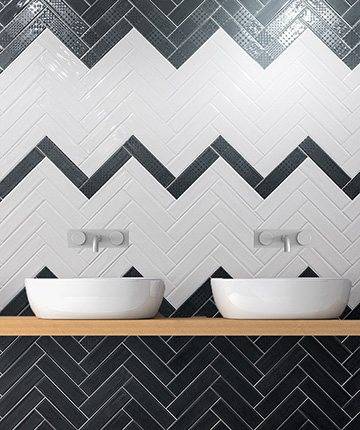 На раскладке под елочку материал укладывается под прямым углом в виде зигзагов, похоже на паркет. «Елочка» применяется как для стен, так и для пола. Такой вид укладки является сложным вариантом, но создающий привлекательный интерьер с помощью простого материала. Не нужно использовать декоры, а использование только фоновой плитки значительно снижается стоимость проекта. При укладке может быть незначительное увеличение отходов материалов.