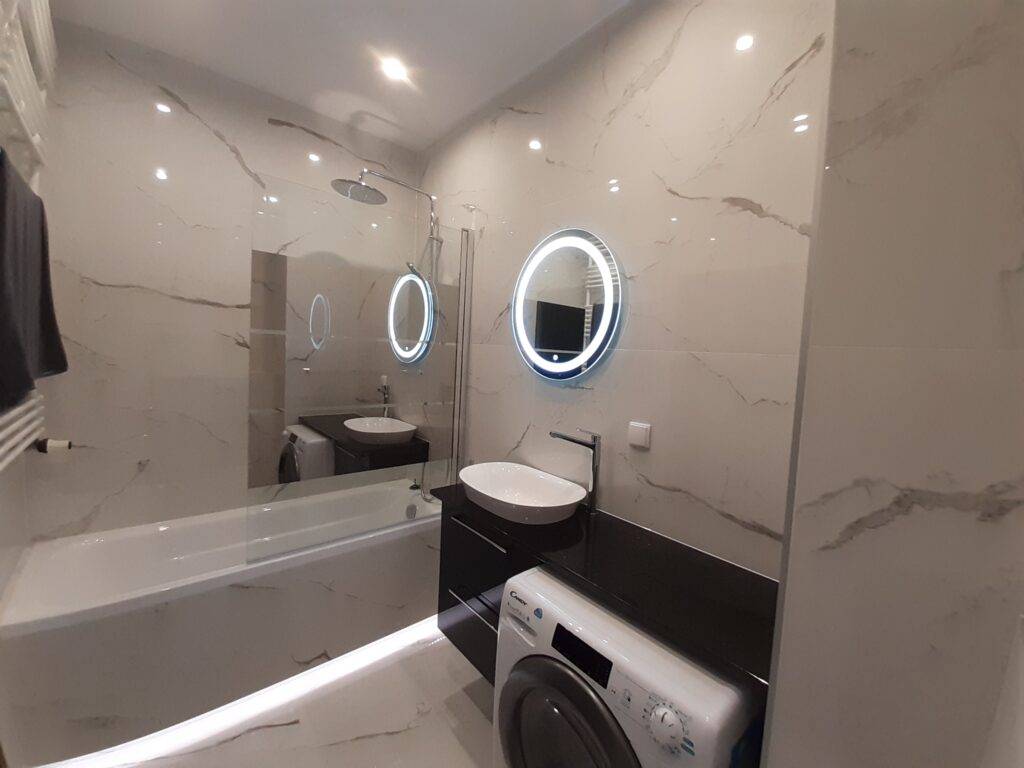 В этом случае достаточно выполнить замеры рабочей поверхности без учета проемов и других участков, которые облицовываться не будут. Такая отделка встречается довольно часто, когда одну и ту же плитку используют для пола, стен, экрана под ванну. Особенно эффектно смотрится плитка больших размеров с имитацией мрамора или гранита.