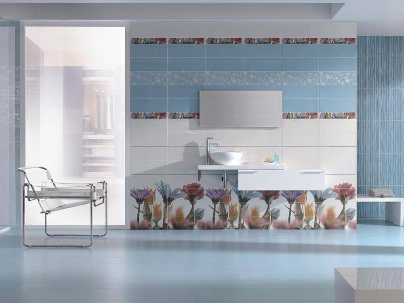 И все же, более распространен вариант, когда для пола используется один вид плитки, для стен другой, а дополняют отделку декоративные бордюры, панно из плитки или мозаики, цветные вставки.