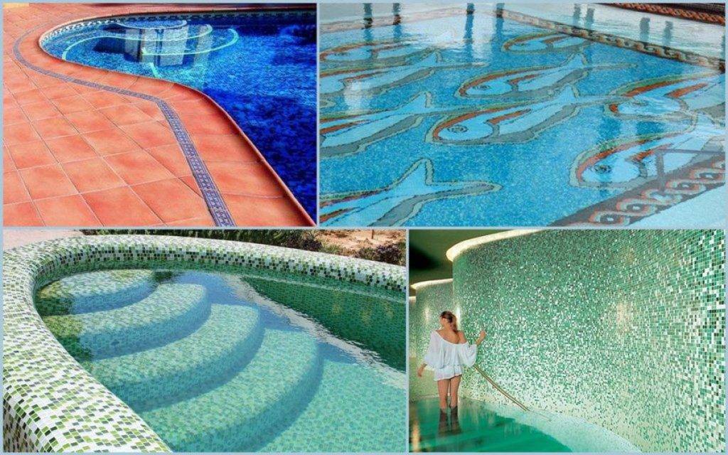 Преимуществом мозаики является гибкость ее основания, поскольку это значительно упрощает укладку на закругленные и фигурные поверхности. Такой плиткой можно частично, полностью или в виде панно из мозаики выложить потолок, пол и стены в помещении, а также подиум, саму чашу и его бортики. Мозаичное исполнение чаще всего изготавливается из мрамора, сланца, оникса, композита, керамики или стекла.