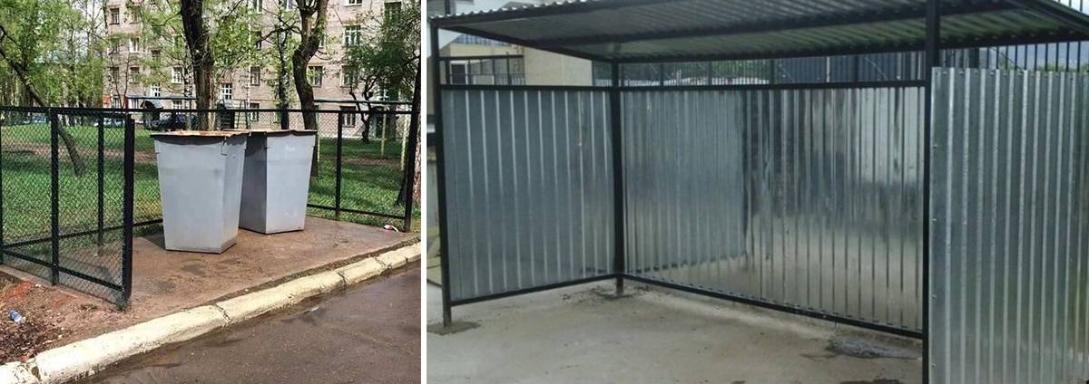 Под бытовые отходы изготавливают ограждения разной площади в зависимости от нужд жильцов: самые маленькие рассчитаны на 2 контейнера, самые большие – на 6. Они могут иметь запирающиеся ворота или свободный вход. Обычно имеют не глухую конструкцию: для вентиляции оставлен зазор между стенками и крышей.