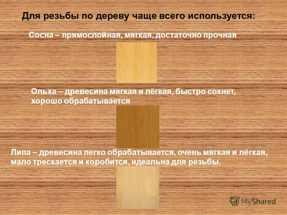 Для изделий с большим количеством прорезей подходят хвойные породы. Мягкий материал сосны, ели, кедра позволяет наносить крупные рисунки и создавать замысловатый орнамент. Новички могут начинать с хвойных пород, а также с липы, березы и осины.