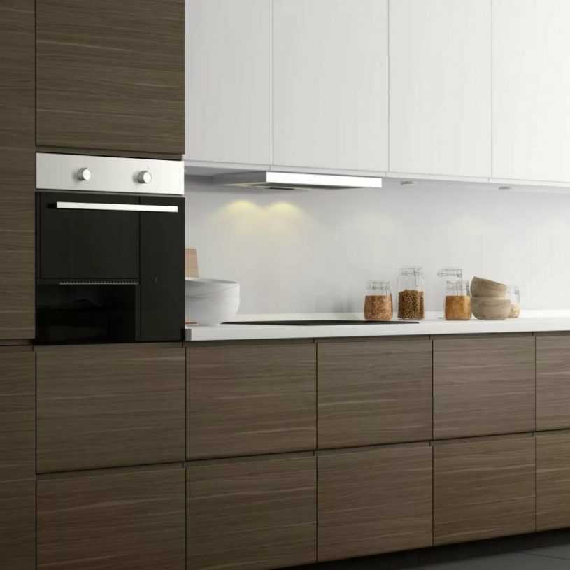 В ассортименте есть фронтальные панели, которые помогут незаметно разместить все бытовые приборы. За фасадами, которые соответствуют выбору дверок нижних и верхних секций, можно спрятать посудомоечную машину, СВЧ-печь или холодильник.