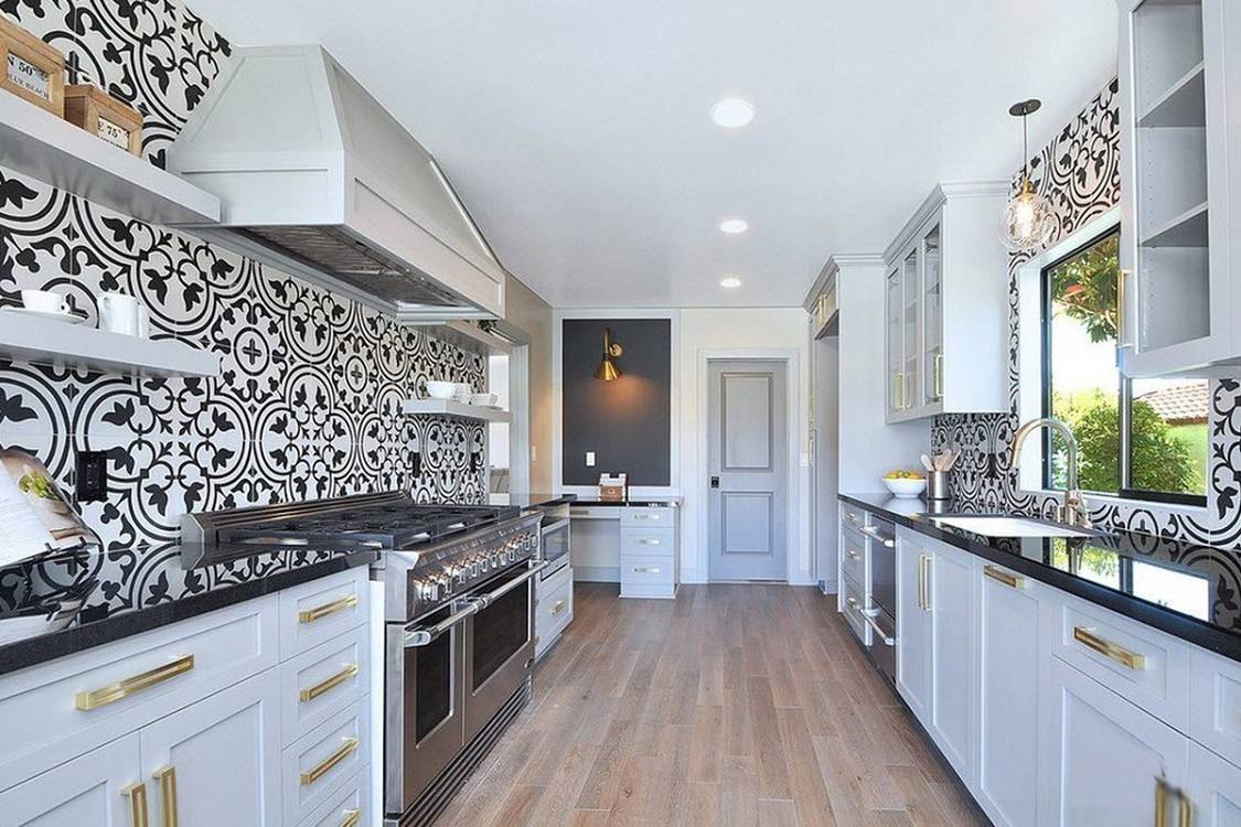 - Характерный «кирпичный» белый фартук. Может использоваться белая/черная квадратная или прямоугольная плитка.