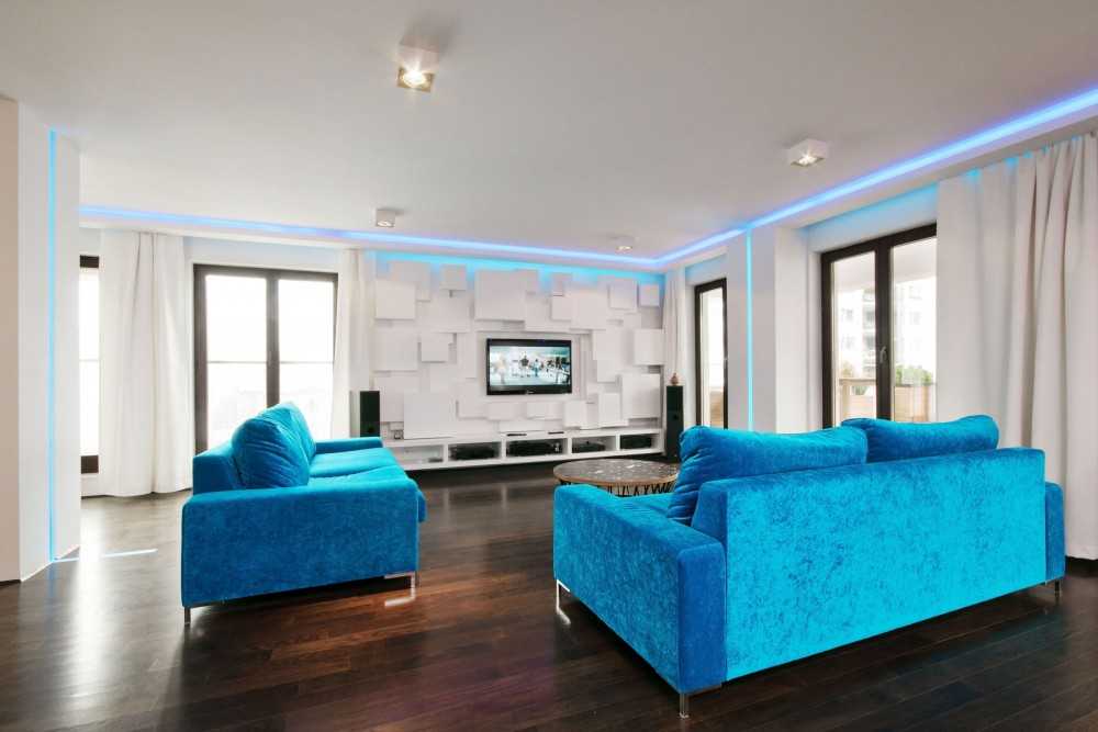 - Синий – цвет энергии и силы. Светлый бук очень красиво смотрится с данным оттенком, добавляя помещению уюта.