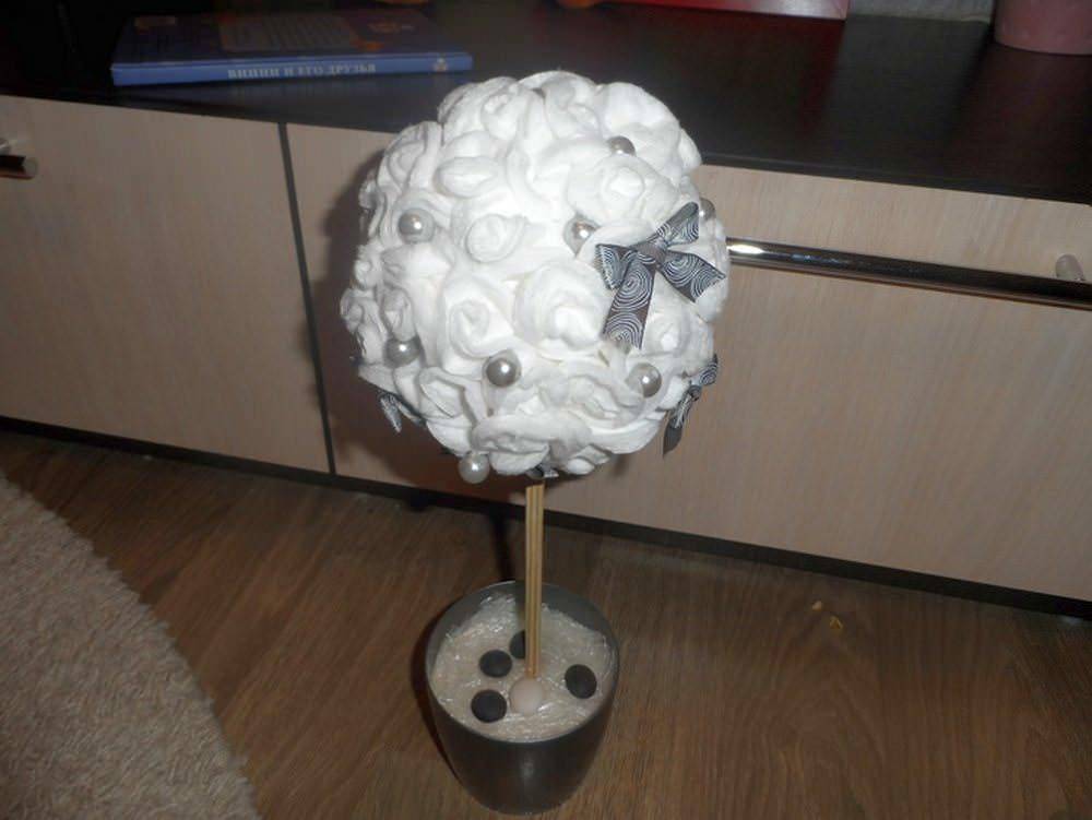 - Все приготовленные цветы приклеиваем к шару. Конечно, идеальным вариантом будет шарик абсолютно ровной формы, приклеивать к нему заготовки будет гораздо проще. Цветы лучше располагать совсем близко друг к другу, не оставляя свободных мест. Чтобы крона выглядела оригинально, кроме цветов на шар приклеиваются бантики, ленточки, стразы, бусины, другие декоративные элементы.