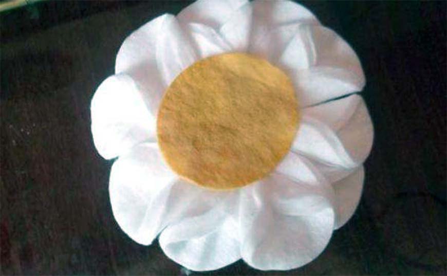 - Диски вымачиваются в крахмале и просушиваются. Формируются изящные лепестки, путём подгибания краев ватной заготовки. Серединку вырезают из плотной материи или фетра желтого цвета и приклеивают по серединке.