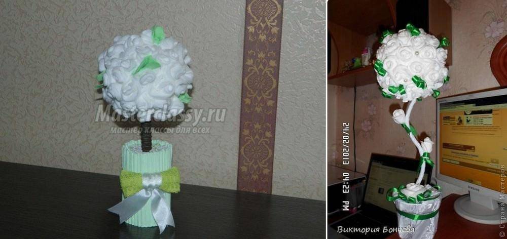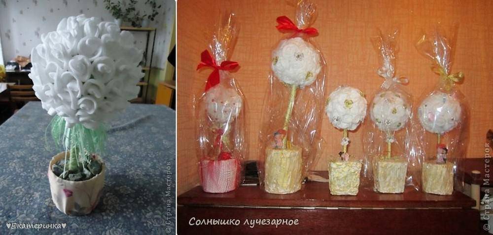 Немного сложнее, но интереснее выполнить из топиарий. Топиарием называют маленькое дерево скульптурной формы. В качестве кроны используются разные подручные материалы. Чтобы создать топиарий необходимо подготовить следующее: