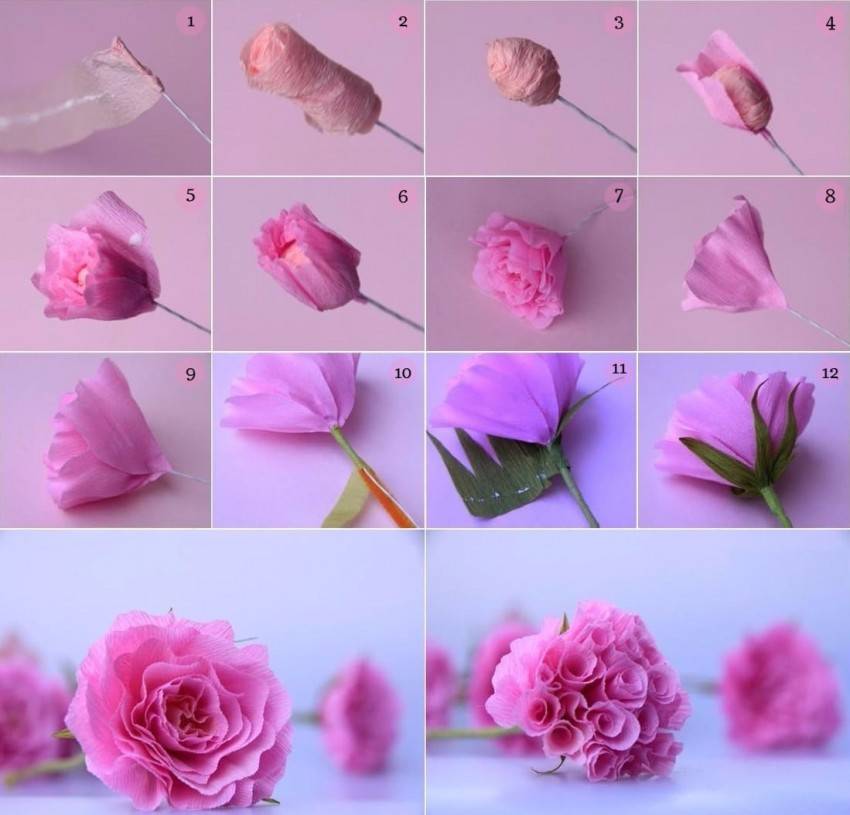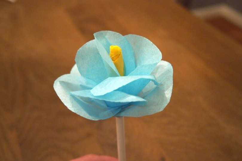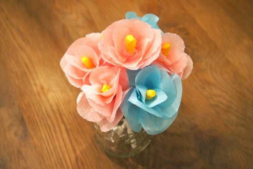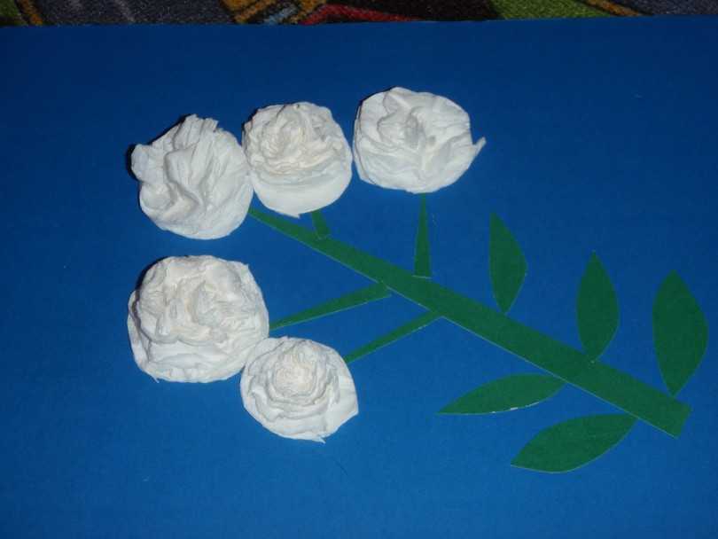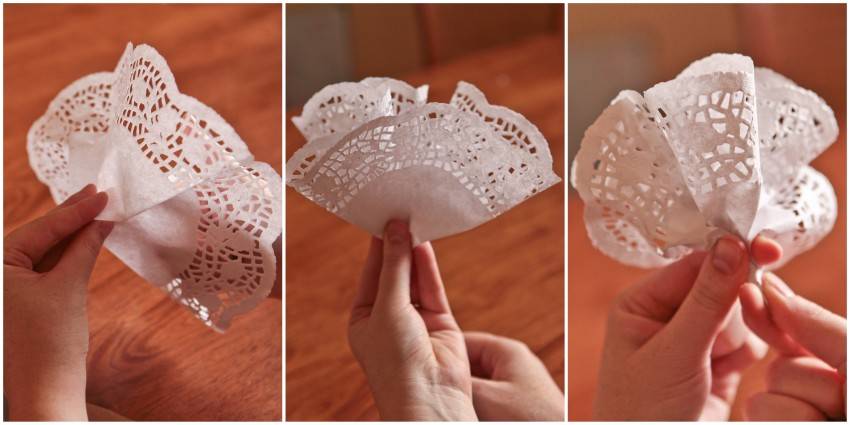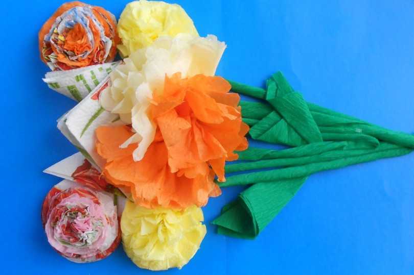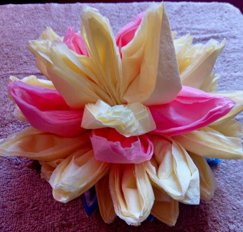 Салфетки складывают в квадраты и фиксируют их посередине степлером. Их края обрезают в форме круга и формируют бутоны, поочерёдно приподнимая и прижимая к центру каждый слой.
