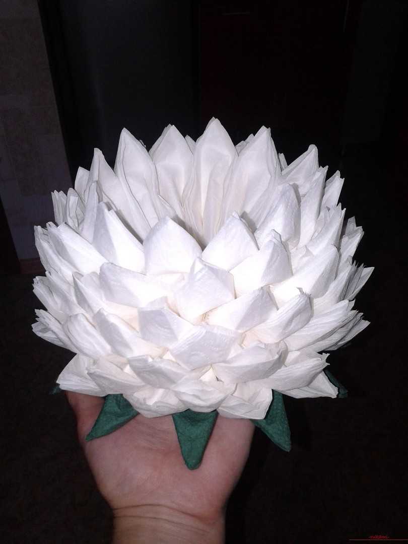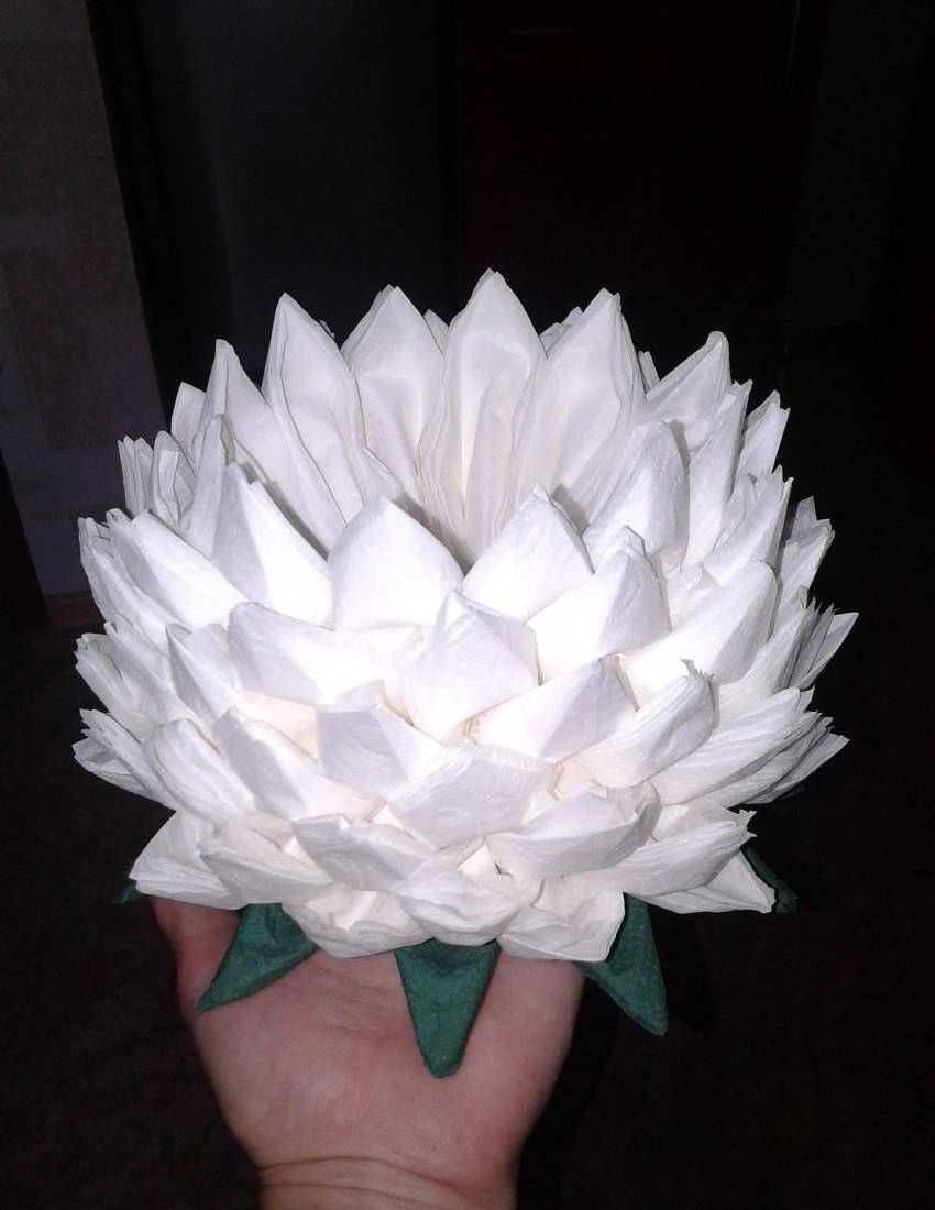 Теперь Вам нужно осторожно освободить обе стороны отдельной салфетки, постепенно создавая бутон цветка. В итоге у Вас получится хризантема.
