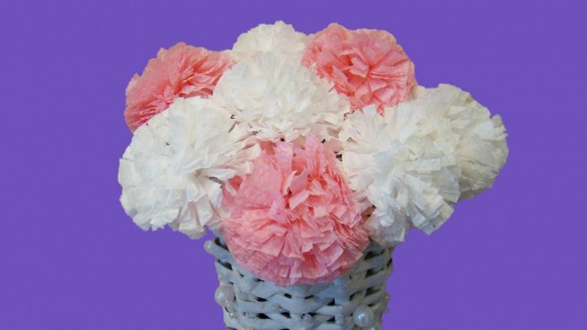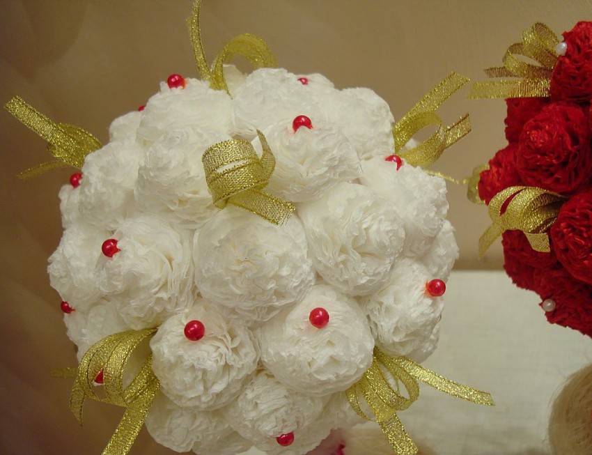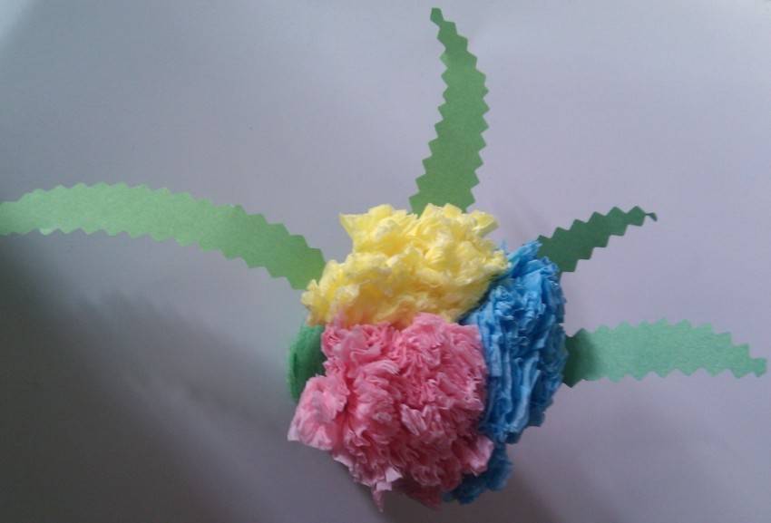 В первую очередь необходимо изготовить основу для букета. Туалетную бумагу рвут на небольшие кусочки. Воздушный шарик надувают до размера соответствующего выбранному цветочной горшку и оклеивают его кусочками бумаги, смоченными в воде. Основу полностью выслушивают и аккуратно извлекают из неё шар.
