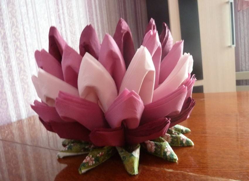 - Сложные формы. На фото показано, как можно расположить на столе тонированные салфетки. Они образуют большой цветок, из которого при необходимости можно выдернуть лепесток.