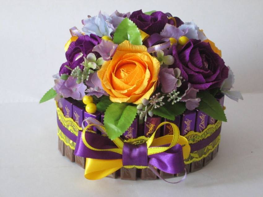 Но если вы хотите по-настоящему удивить человека, для которого подарок предназначается, можно задуматься и о создании целой поделки из сладостей. Например, сделать красивую шкатулку, отделанную бумажными цветами и конфетами.