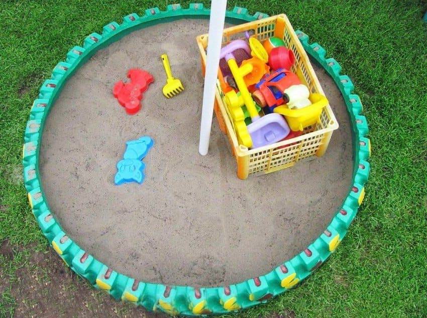 Детвора должна обязательно по достоинству оценить необычную песочницу из покрышки, организованную в виде уложенной плашмя шиной с наполненной внутрь мытым речным песком.