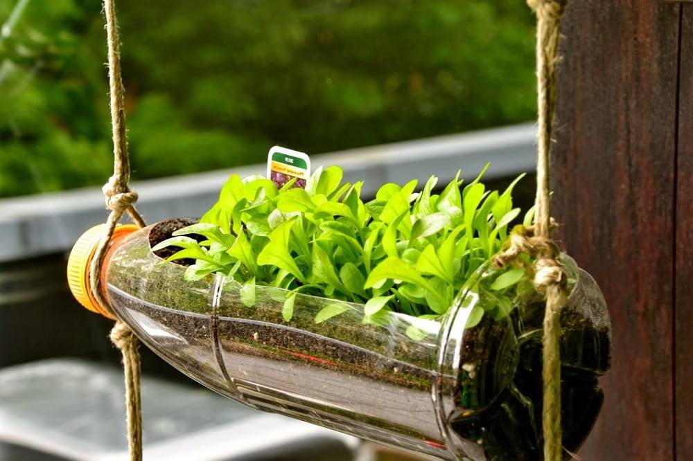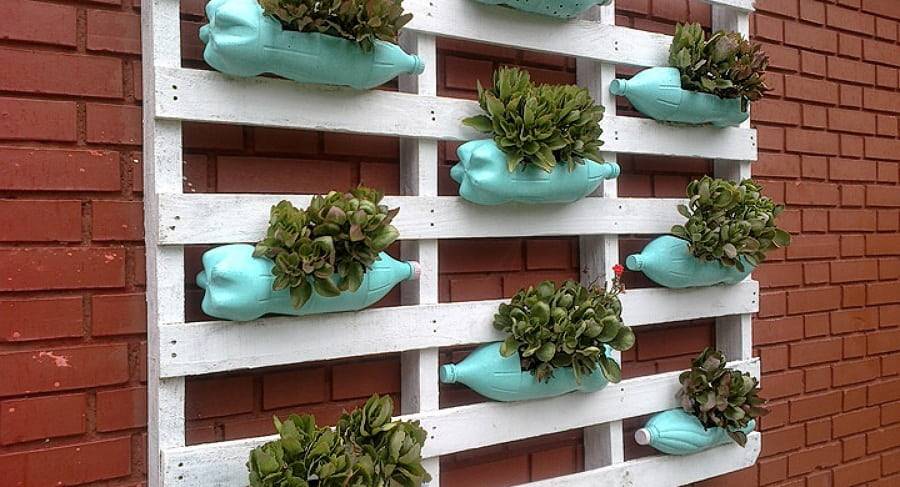 Пластиковые бутылки — прикрепленные к вертикальной стене в горизонтальном направлении, создают удивительный по красоте водопад зелени. Делается он очень просто. Используя канцелярский нож или ножницы, в каждой бутылке вырезается верхняя часть, далее емкость наполняется землей в которую высаживается любимые цветы и растения.