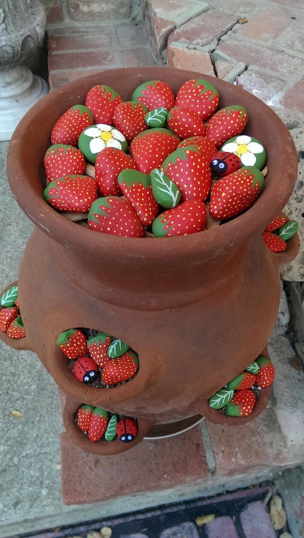 Грибочки можно выполнить из камушек и тазиков, раскрашенных в красный цвет.