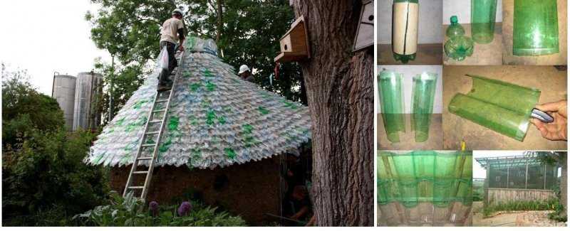 Даруя вторую жизнь пластиковой таре, вы защищаете природу от загрязнения. Помимо обычных поделок из пластмассовых бутылок, можно использовать ПЭТ-ёмкости для возведения различных хозяйственных построек – теплицы, навеса, сарая, летнего душа, туалета. Возможно даже строительство дачного домика из них.