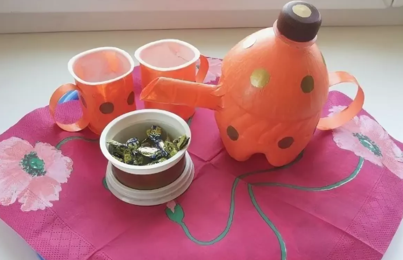 Из пластиковой тары для детей можно смастерить много чего интересного и веселого. Можно устроить чаепитие на свежем воздухе. Сервиз вам тогда просто необходим.