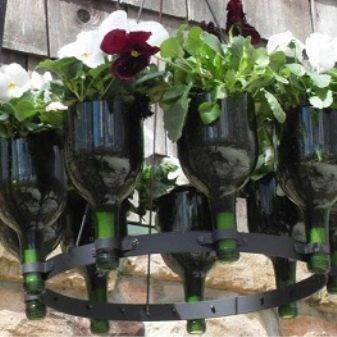 Эта поделка понравится многим цветоводам. Для создания подвесного горшка от бутылки надо отрезать нижнюю часть. Горлышко при этом нужно заткнуть пробкой. Из бечёвки следует сплести основу для стеклянного горшка. Бутылку надо поместить в подготовленную заранее сетку и заполнить землёй и семенами. Такой оригинальный подвесной горшок будет прекрасно смотреться на балконе или террасе.