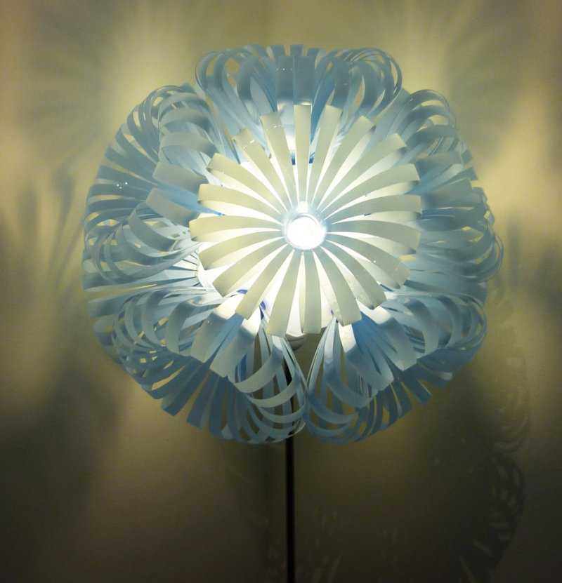 - В центральную часть цветка прикрепляют дно пластиковой бутылочки.