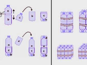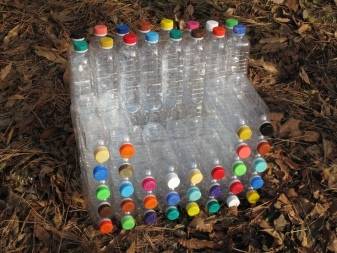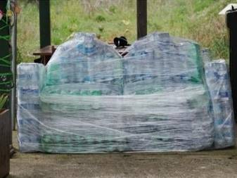 Мало кто знает, но из пластиковых бутылок на участке получится сделать очень удобные диваны и кресла, на которые можно будет присесть, чтоб отдохнуть от садовых забот. Не стоит думать, что в изготовлении эти предметы окажутся очень сложными. К примеру, тот же небольшой стул или пуф человек сможет соорудить безо всякого труда. Достаточно собрать из тары куб по определенной схеме. Его обшивают поролоном и тканью. Таким же способом допустимо изготовить сразу 2 куба и разместить между ними доску. В результате получится простая скамейка.
