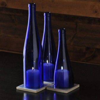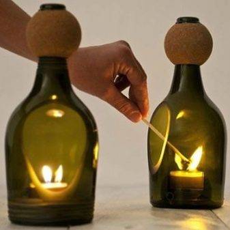 Для создания оригинального подсвечника можно использовать бутылку из-под шампанского или вина. Делается он достаточно просто. От бутылки нужно отрезать нижнюю часть. Для этого используется обычный стеклорез. Край бутылки можно дополнительно обработать водостойкой шкуркой. Он получится ровным и аккуратным. Готовое изделие используют как обычный подсвечник.