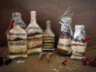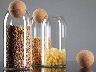 Оригинальное украшение для кухни получится из бутылок с отрезанным горлышком. Как и в случае с подсвечниками, место среза обязательно выравнивается. Подготовленную таким образом ёмкость надо вымыть, просушить и заполнить крупой. В качестве крышки можно использовать обычный корковый шар. Такие поделки не только красивые, но и полезные.