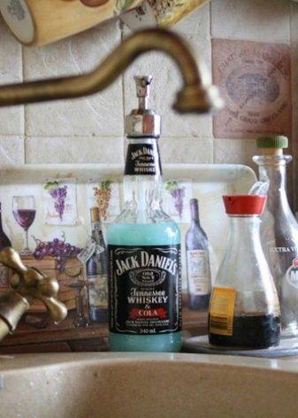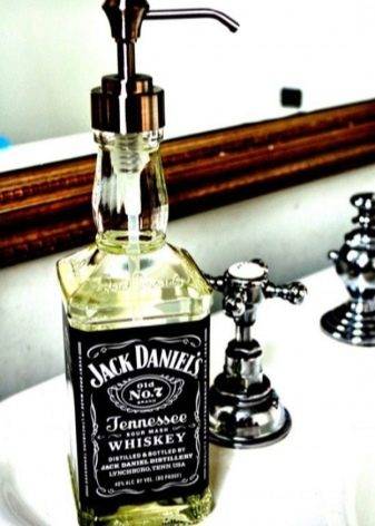 Оригинальное украшение для ванной можно легко сделать из бутылки из-под виски. Для этого ёмкость надо хорошо вымыть и высушить. Затем пробку нужно заменить на насадку для мыла подходящего размера. Чтобы этикетка не размокла под воздействием воды, её можно предварительно покрыть прозрачным лаком. Это сделает поделку более долговечной.