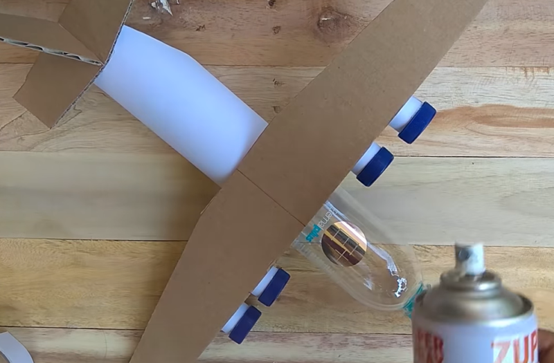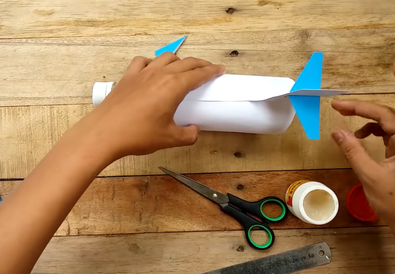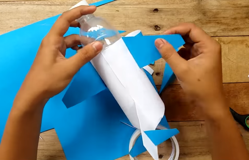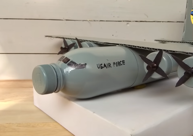 Клеим к основе самолета на двухсторонний скотч либо на горячий клей. Создаем четыре турбины из бумаги и пробок.