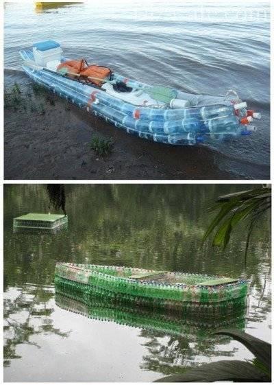 Из пластиковых бутылок получится вполне устойчивая на воде лодка или плот