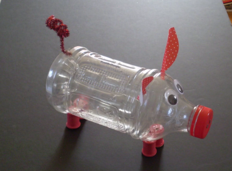 Нарисованная мордочка и ушки дополнят облик животного. К спине можно приделать корзинки из маленьких бутылочек. Насыпав туда земли и посадив миниатюрные цветы, можно сделать необычную клумбу.