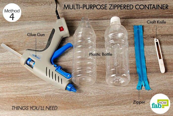Вам понадобится: 2 пол литровые пластиковые бутылки, молния, клеевой пистолет, канцелярский ножик.