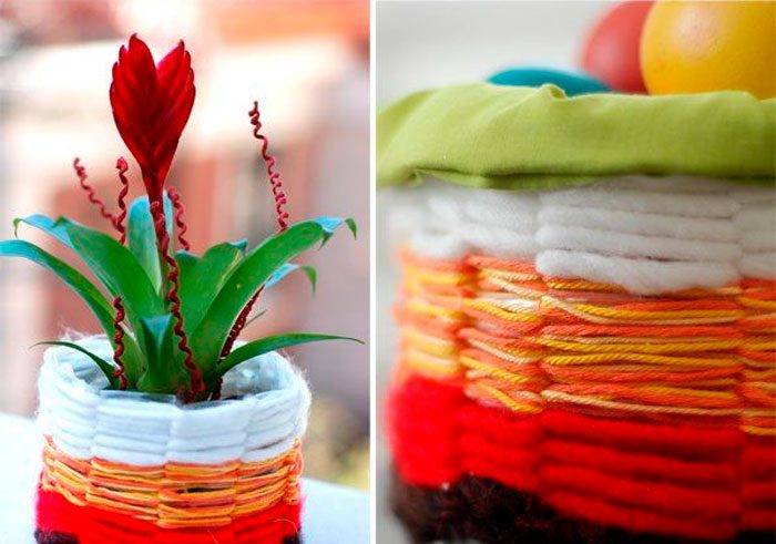 - Начните плетение таким способом: оплетайте полосы через одну – первую спереди, вторую – сзади. Снизу постепенно поднимайтесь вверх, оплетая всю вазу.