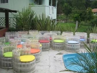 Из бутылок на даче можно сделать не только разного рода фигурки, вроде гнома, лебедя, бабочек и пальм, но и более полезные элементы. К таковым относится садовая мебель. Если сделать ее правильно, она получится надежной и крепкой.