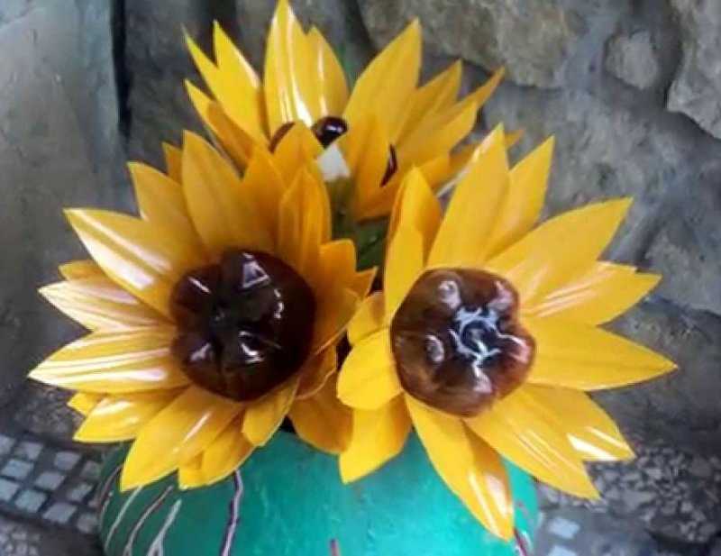 С помощью пластиковых бутылок можно создать красивые подсолнухи. В этом случае творческий процесс также порадует удивительной легкостью.