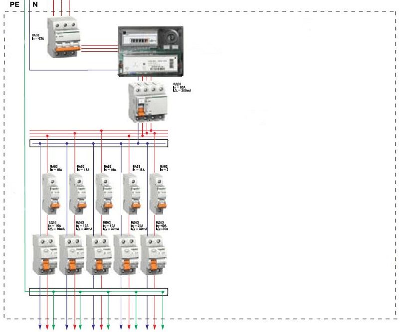 В данной схеме электрического щита фазы распределены на отдельную нагрузку, через однополюсные автоматы и дифференциальные выключатели. L1, L2 и L3 равномерно нагружены потребителями, согласно предварительно посчитанной предполагаемой нагрузке.