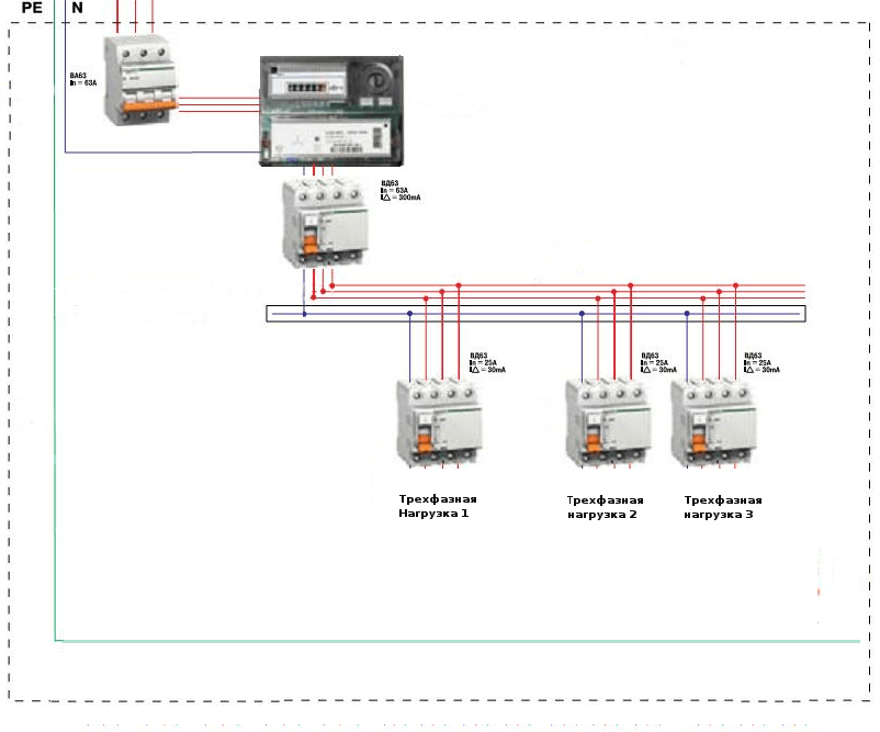 Для подключения трехфазного домашнего оборудования собрать щит нужно будет по следующей схеме: