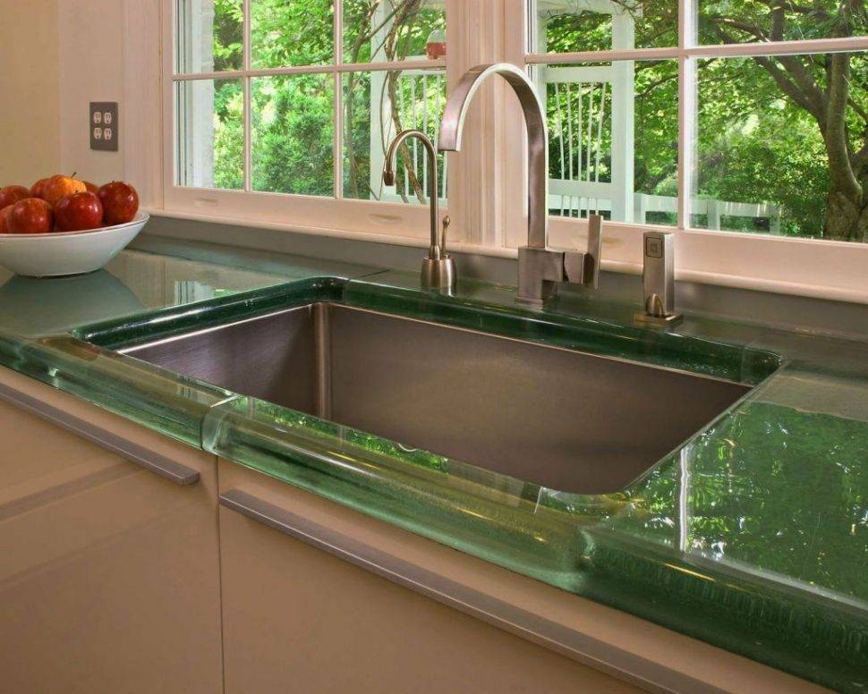 Богатый и необычайно красивый вид имеют стеклянные столешницы, популярность которых никогда не угасает.