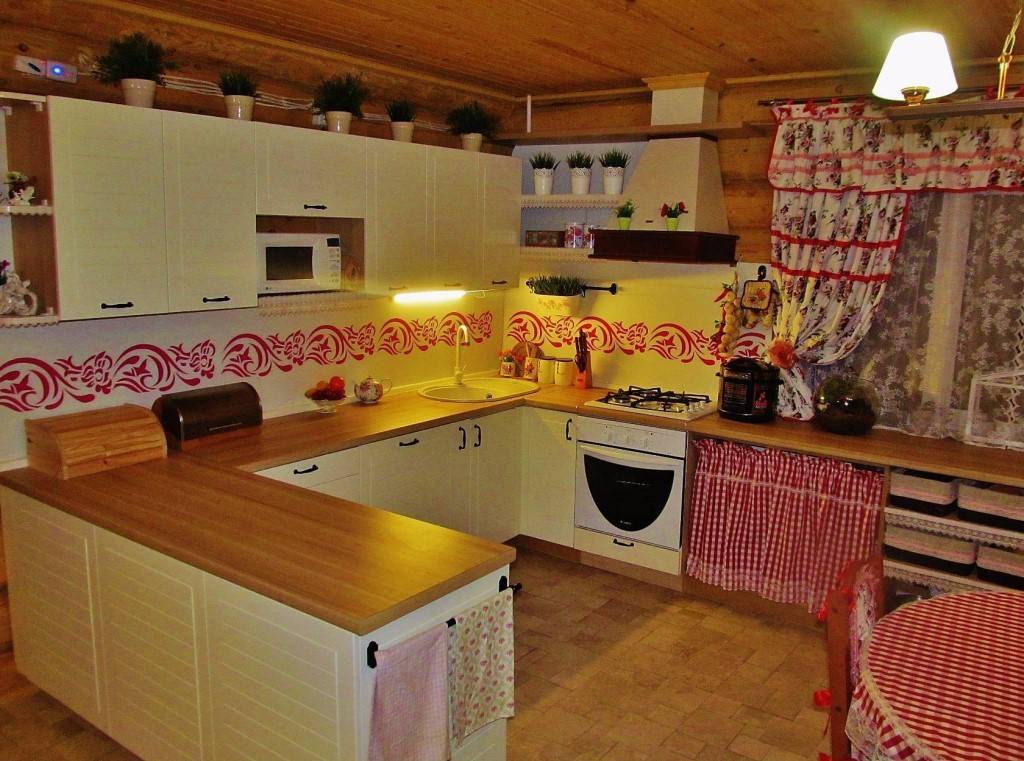 Для этого стиля подойдет стол из выбеленного дерева с искусственными потертостями. Вместо обоев – обнаженная кирпичная кладка или обшивка натуральными досками. Ткани для коротких штор стоит выбирать натуральные и незатейливые, без крупных узоров и принтов.