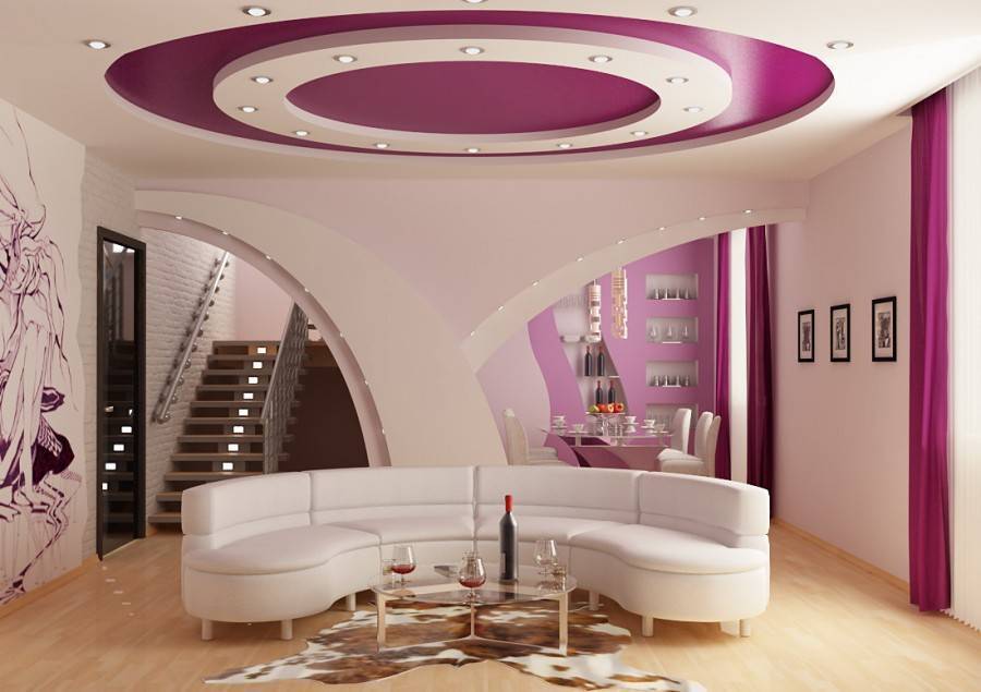 Так конструкции из гипсокартонных плит могут быть самыми разнообразными и нестандартными, зачастую в их оформлении использует разнообразные виды композиций и фигур. Это дает определенную изюминку дизайну многоуровневых потолков. Зависит внешний вид потолочной конструкции, от того, каков общий замысел дизайнера и в каком стиле оформлено помещение.