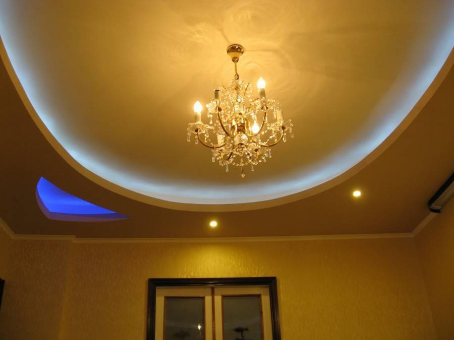 Далее гипсокартон грунтуется, наносится черновой и чистовой слои шпаклевки с помощью шпателей. Прорезаются отверстия под точечные светильники, в нише крепится светодиодная лента, другие трековые источники света. Контакты хорошо изолируются и прячутся. Поверхность красится в выбранные тона. Потолок из гипсокартона двухуровневый с подсветкой своими руками готов.
