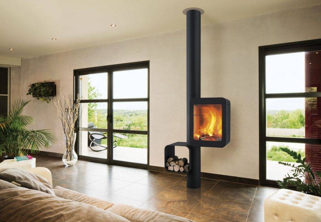 В этом варианте открытое пламя видно со всех сторон. Даже в относительно строгом интерьере «Хай тек» можно создать уютное ощущение присутствия около костра на пикнике. Для гармоничного размещения такой конструкции требуются высокий потолок и большая площадь комнаты. Придется тщательно продумать место хранения оперативного запаса дров, систему подачи свежего воздуха и удаления золы. Необходимо обеспечить хорошую функциональность без ухудшения эстетических параметров.