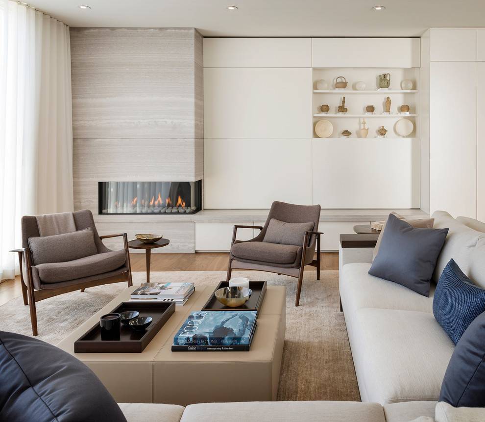 Зона отдыха возле оштукатуренного углового камина элегантного дизайна